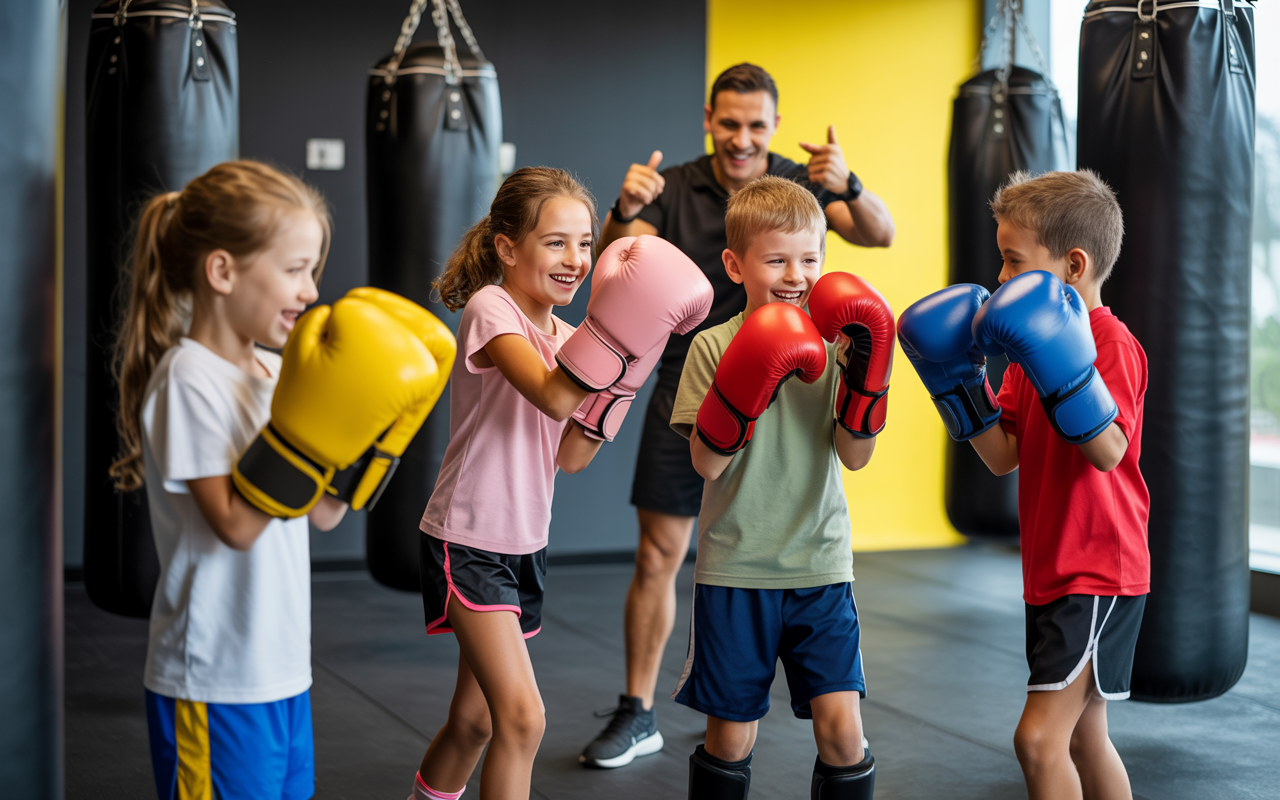 Kids learn boxing basics such as stance, footwork, and simple combinations using pads,